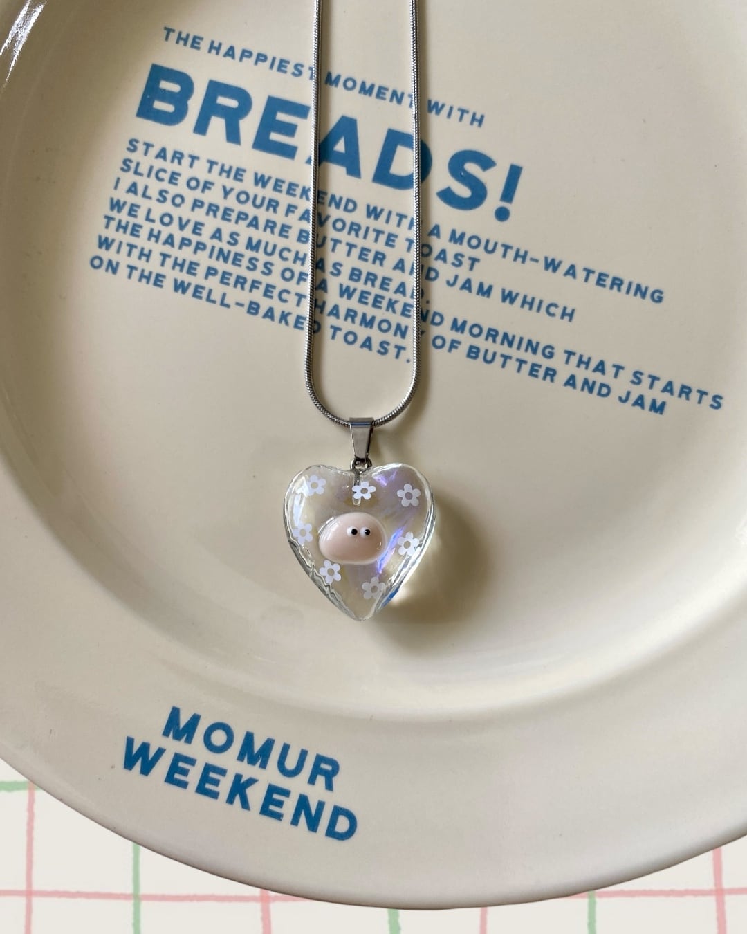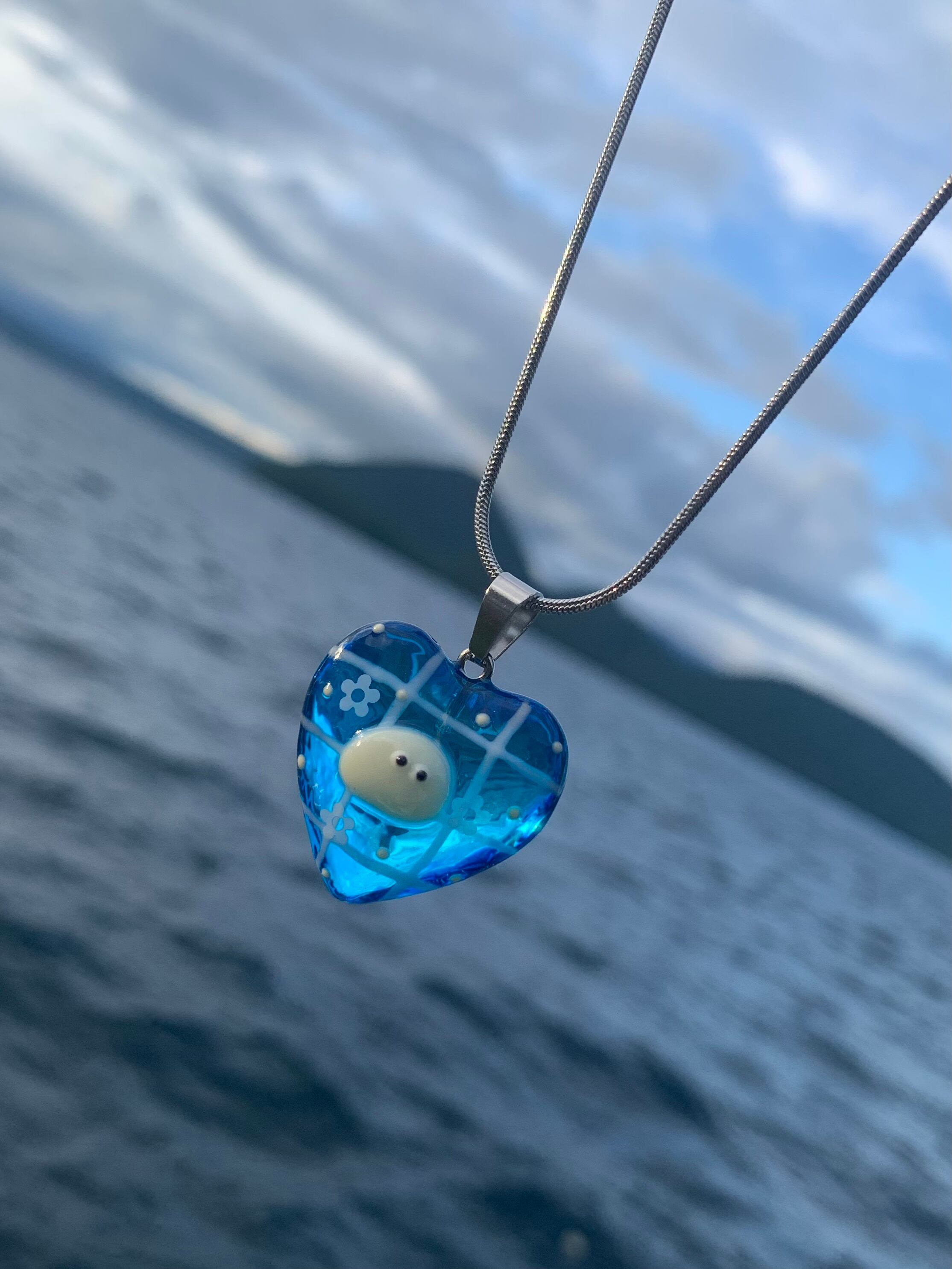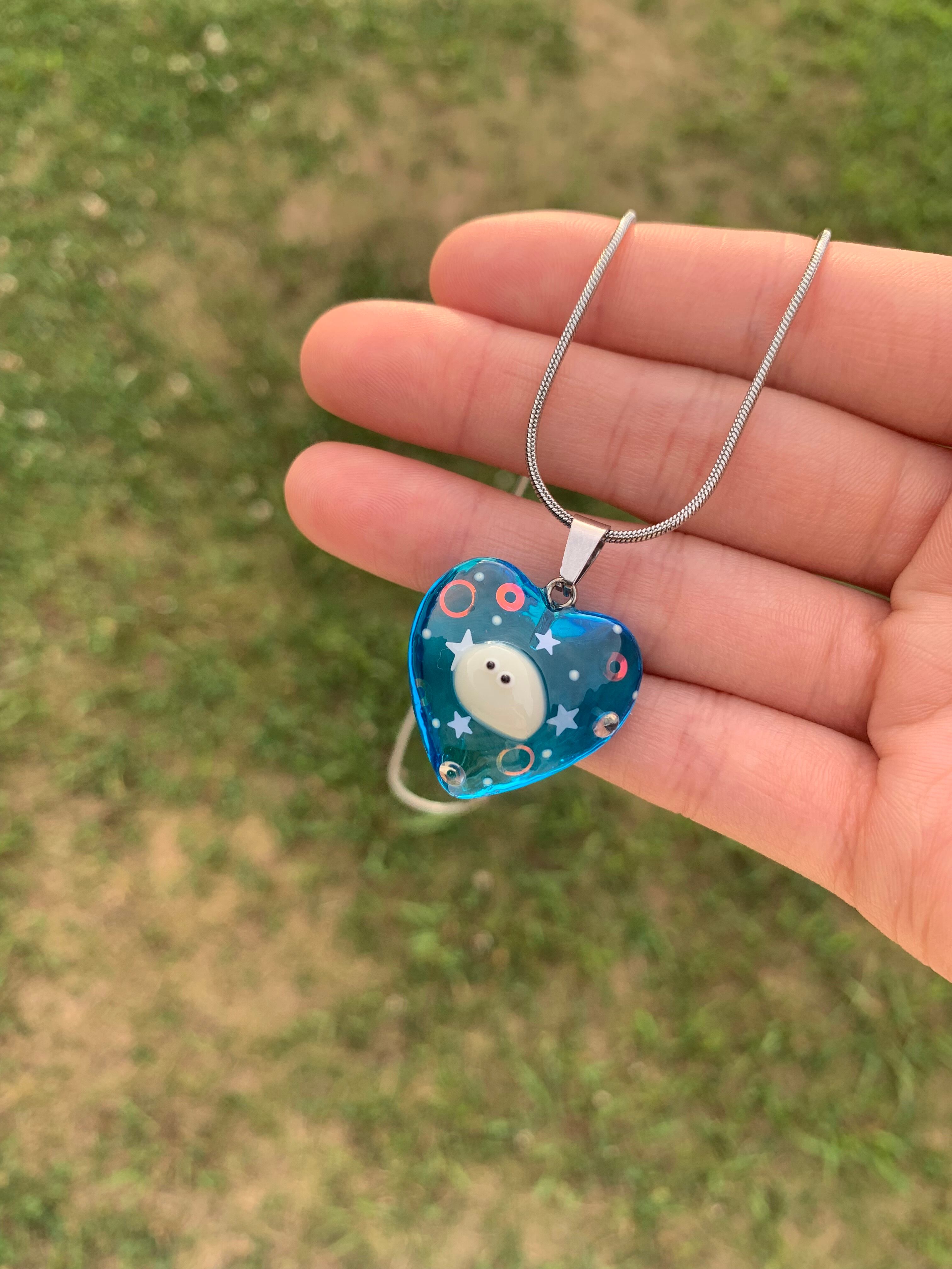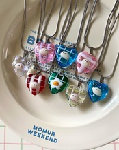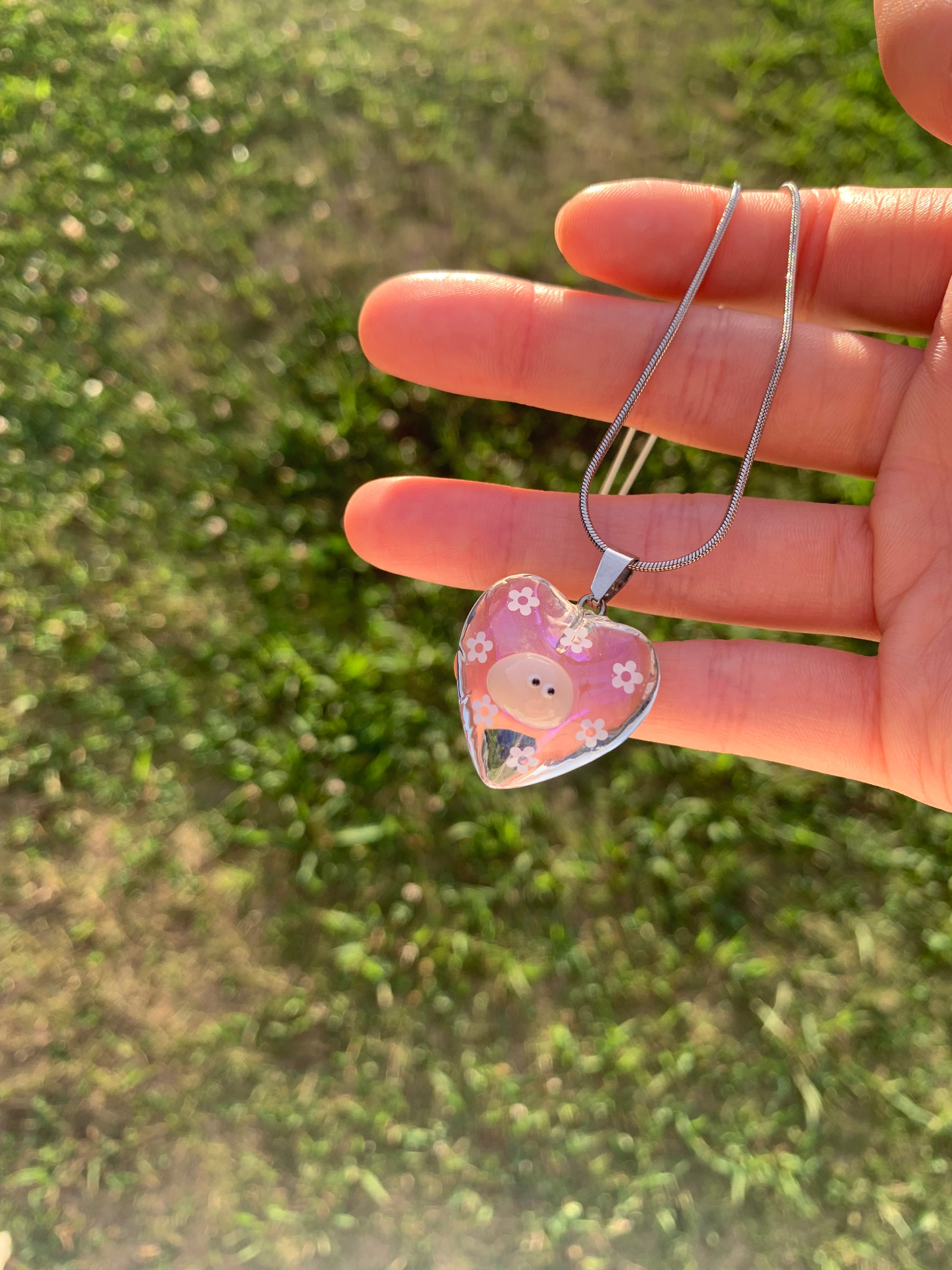 素材:ステンレスシルバーチェーン、ガラスハートチャーム、レジン