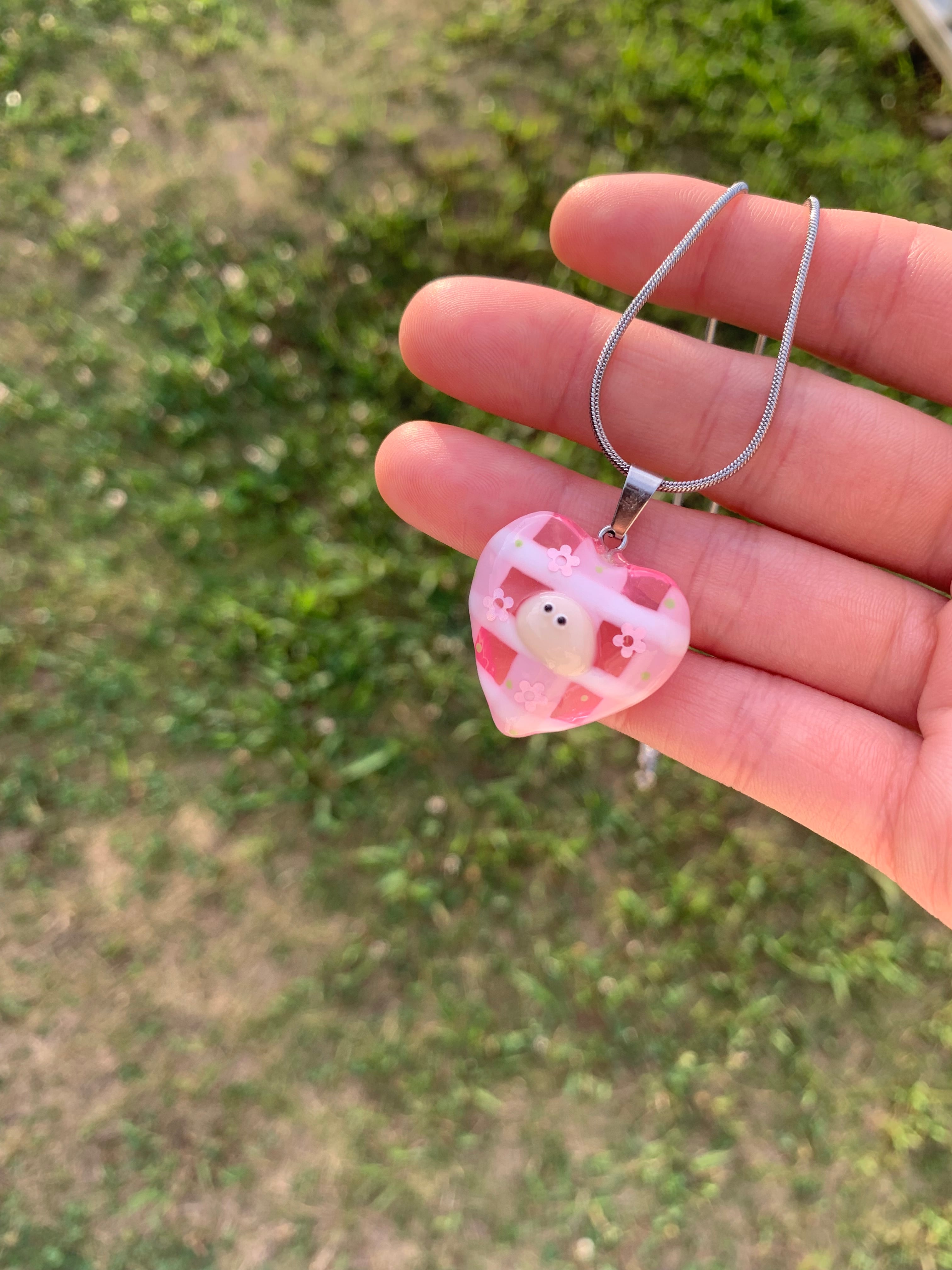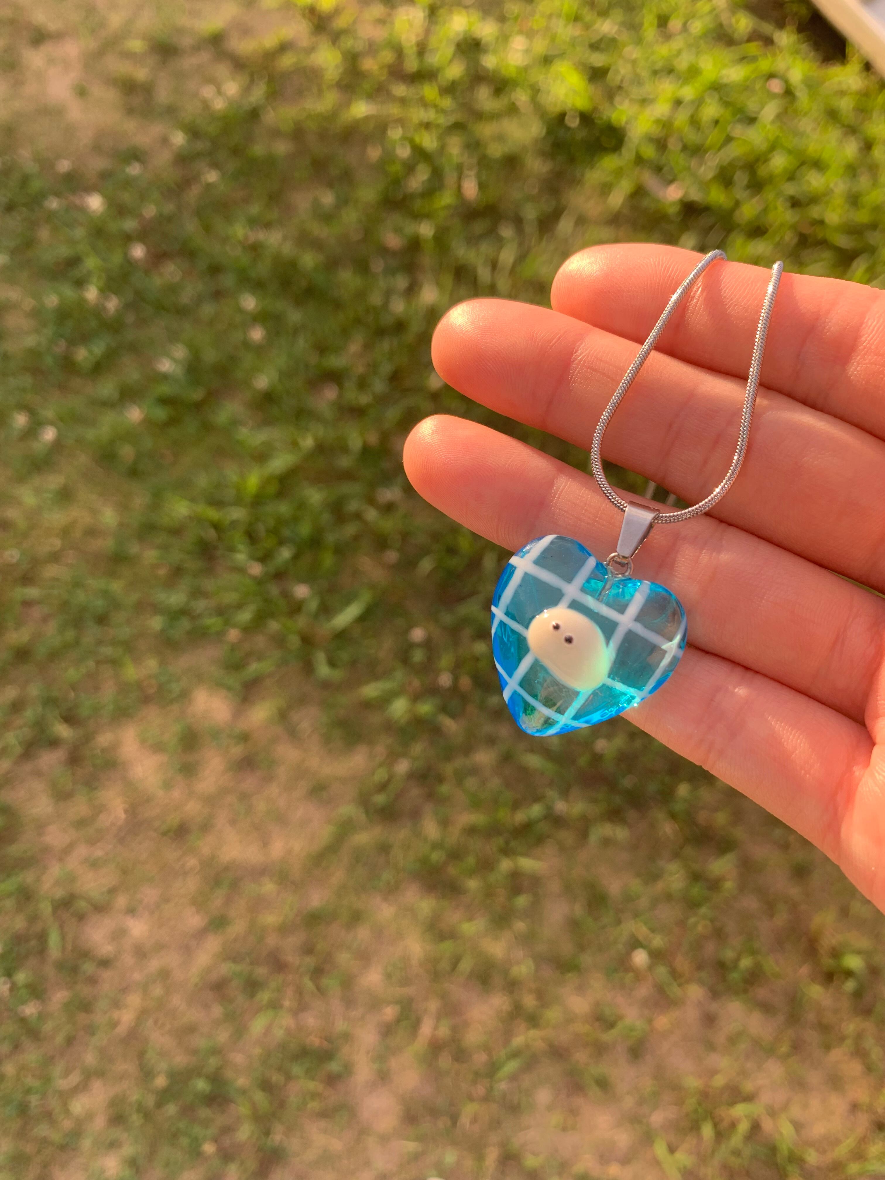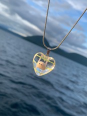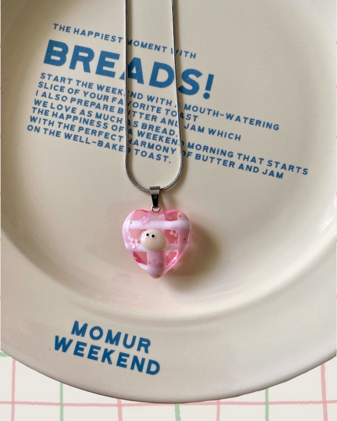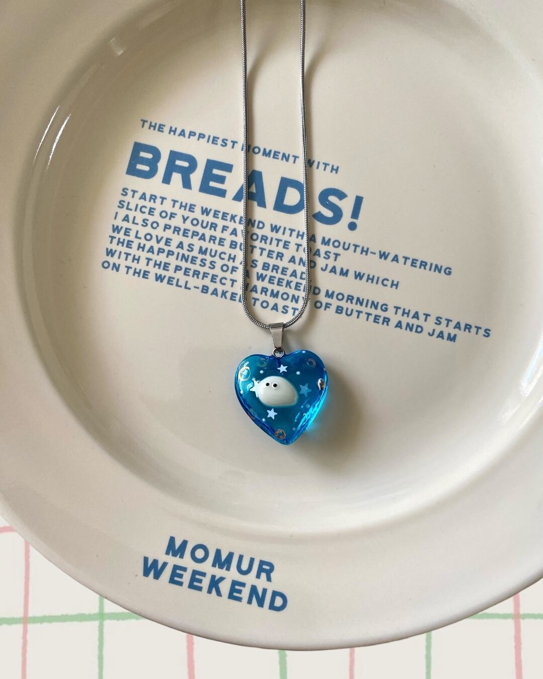 素材:ステンレスシルバーチェーン、ガラスハートチャーム、レジン