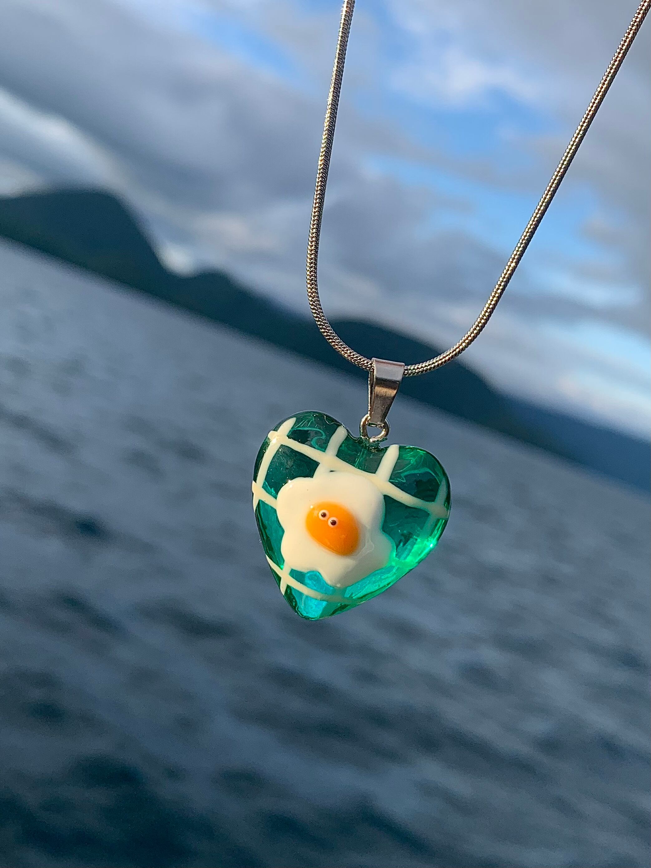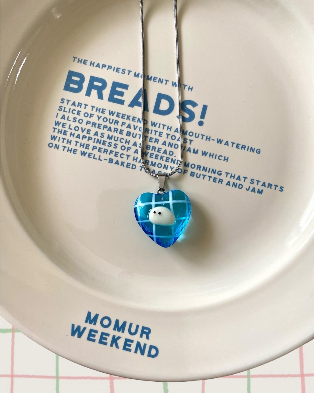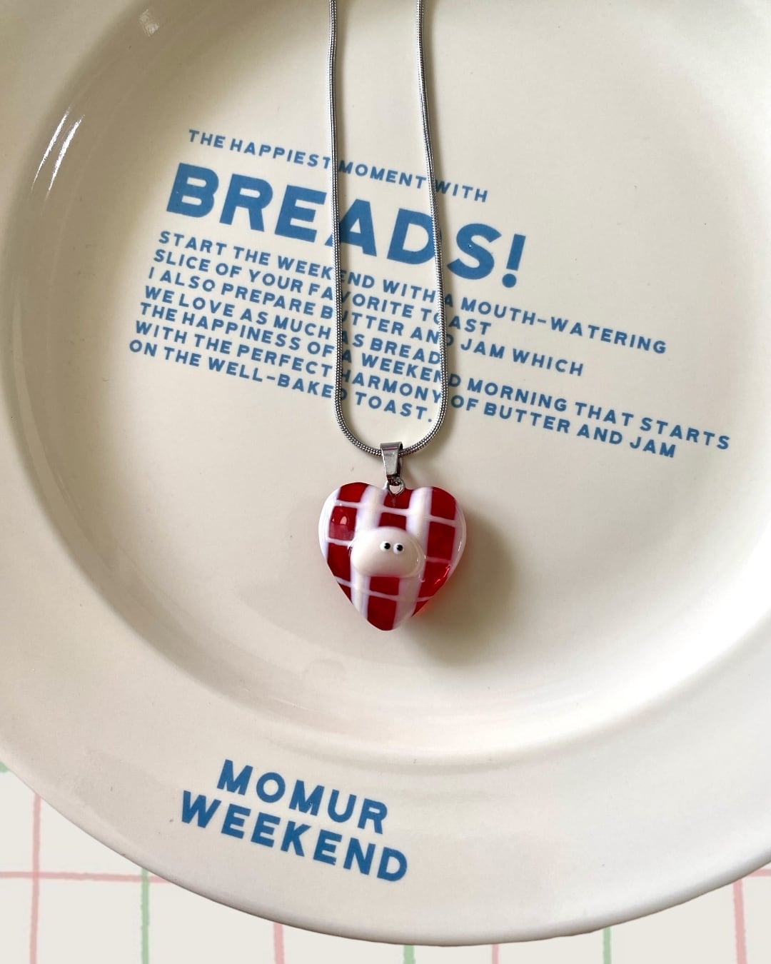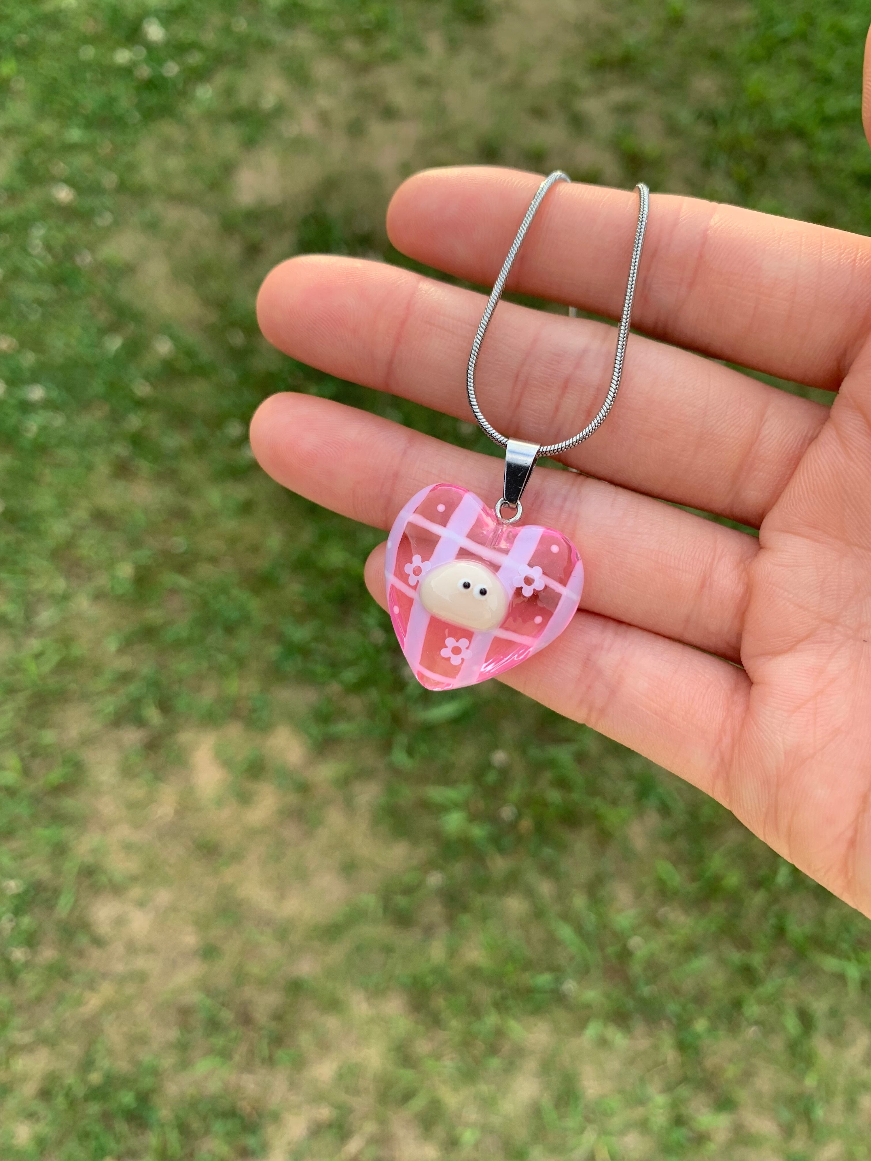 素材:ステンレスシルバーチェーン、ガラスハートチャーム、レジン