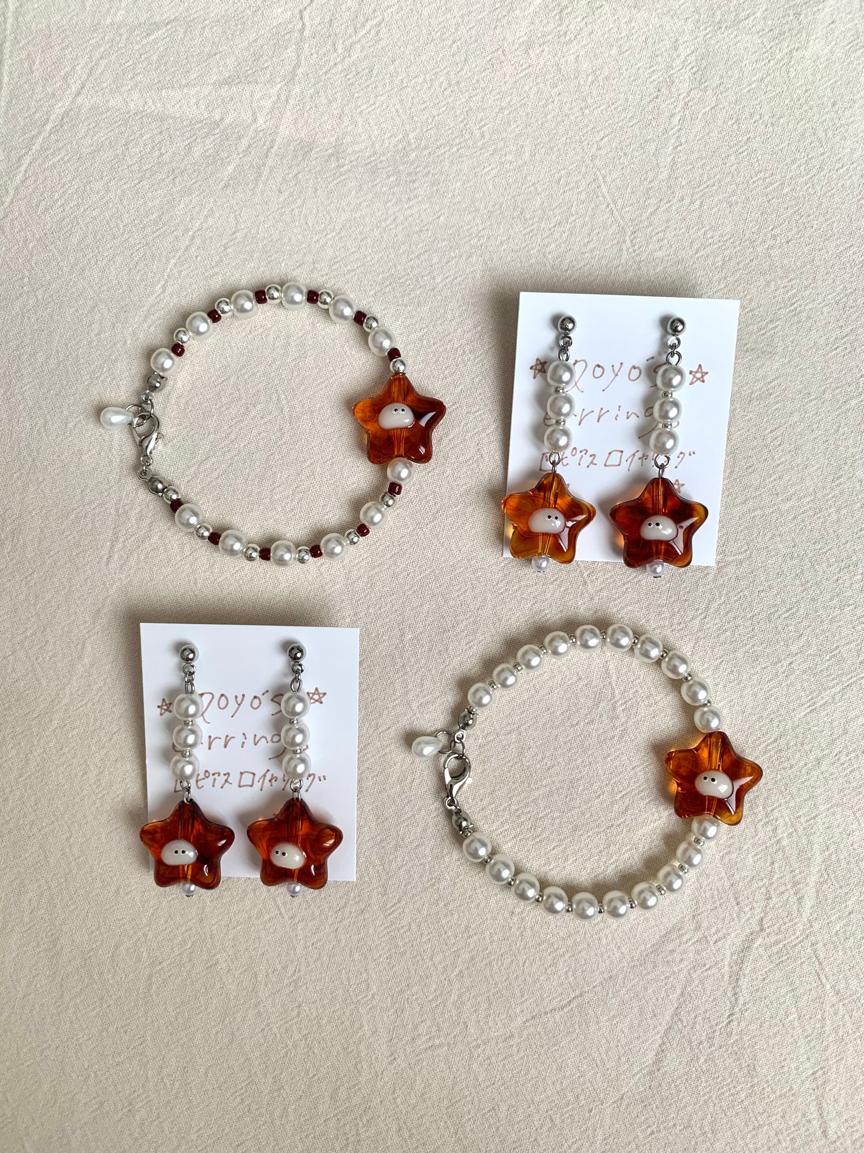 素材:ステンレス金具、アクリル製星ビーズ、パール、シードビーズ、レジン他