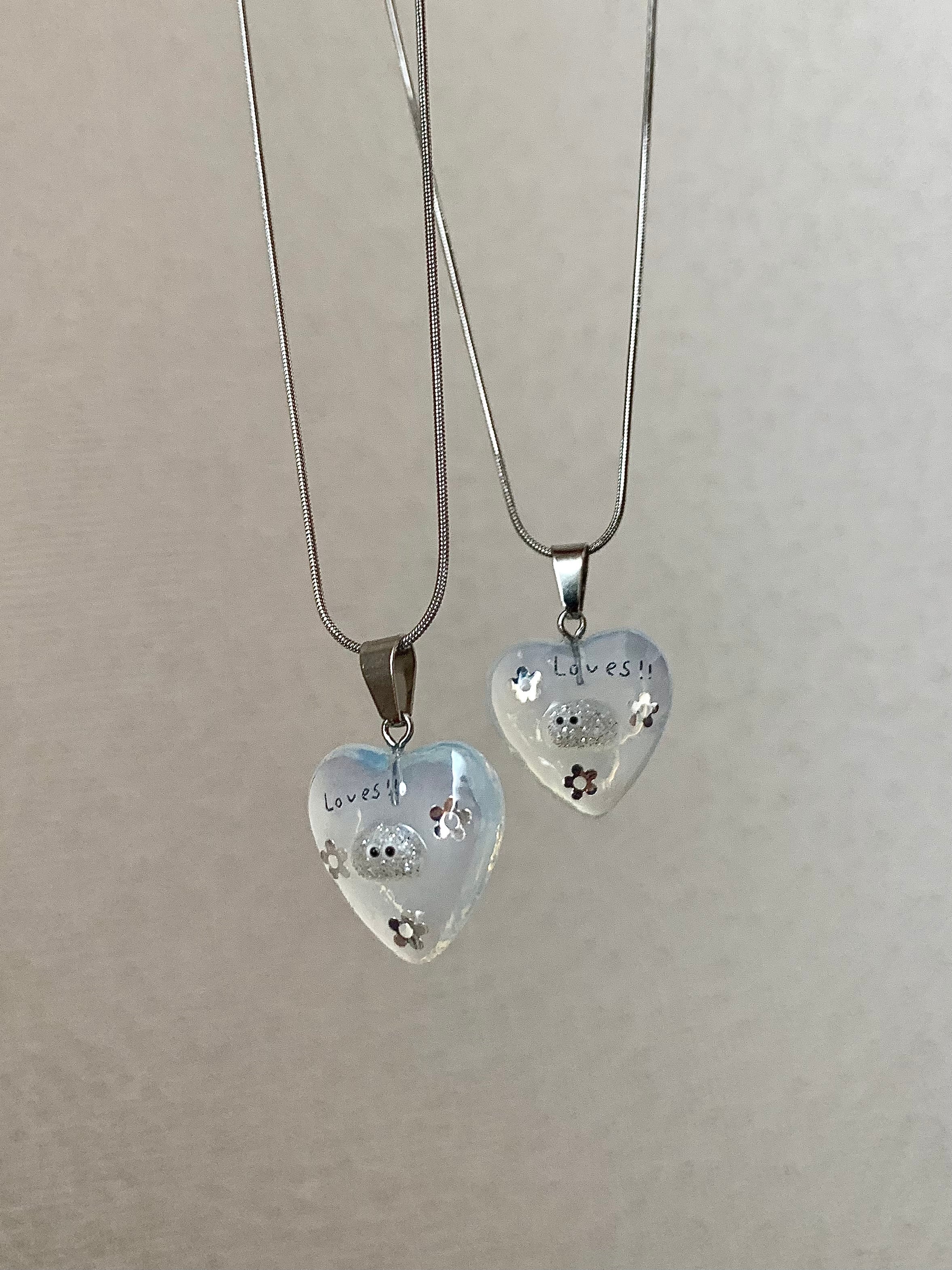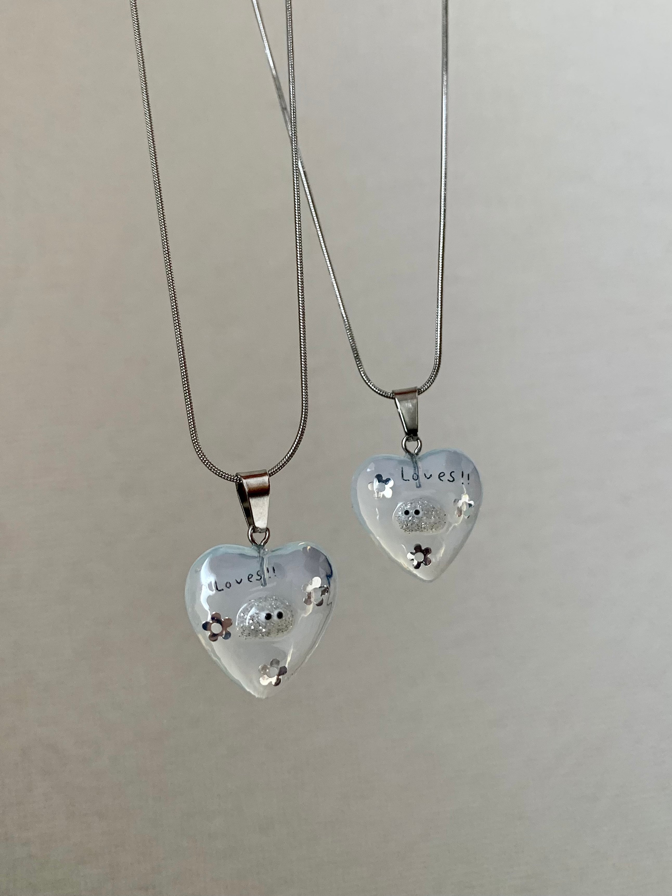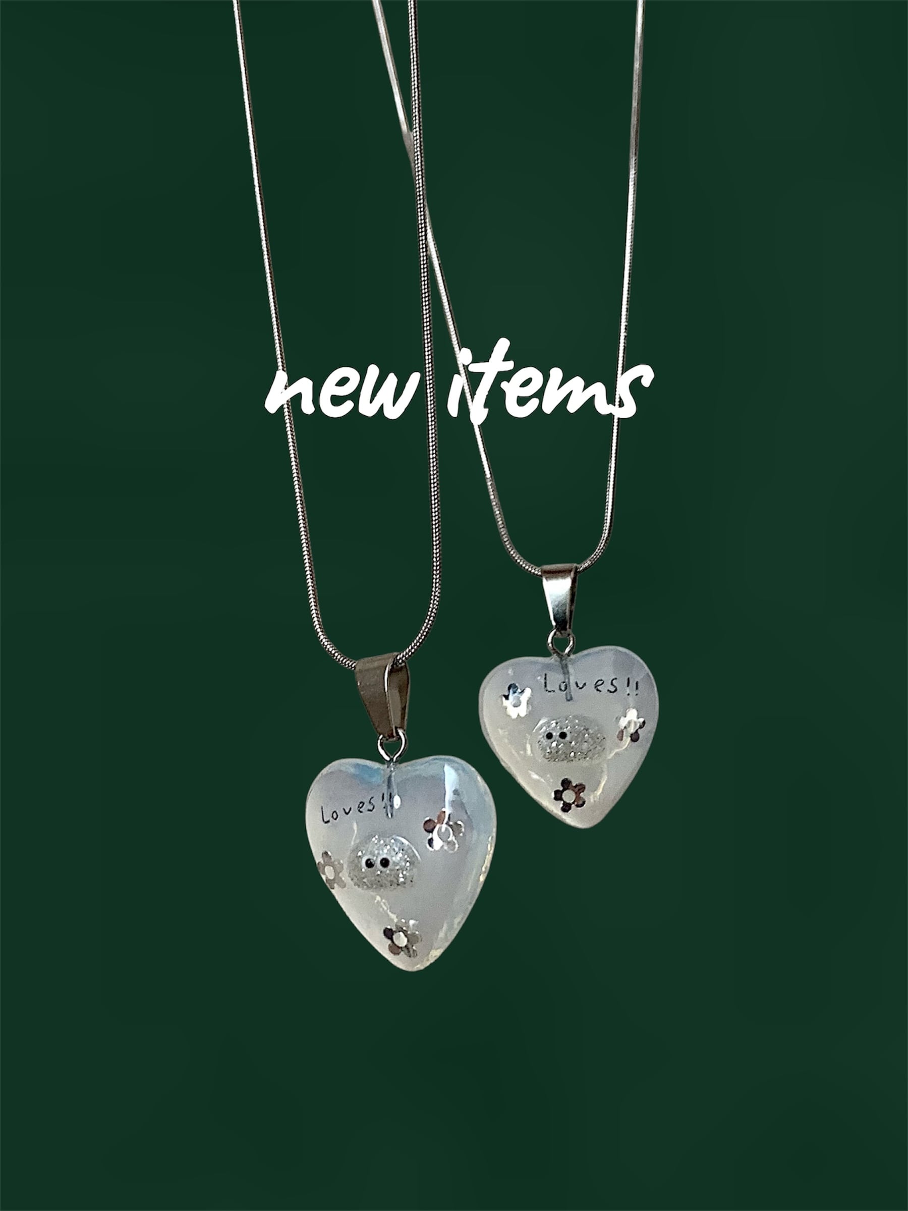 素材:ステンレスシルバーチェーン、ガラスハートチャーム、レジン、アクリル他