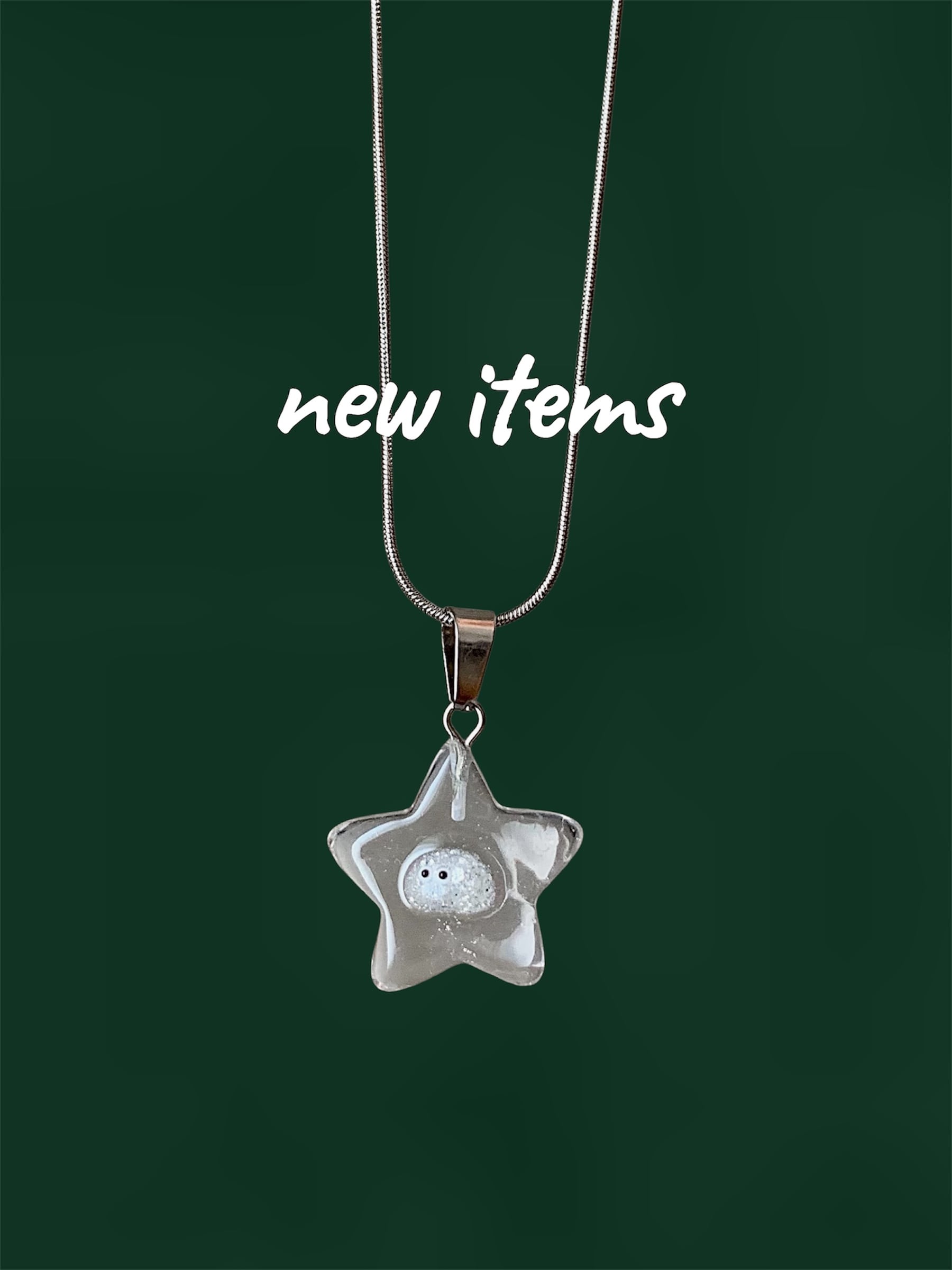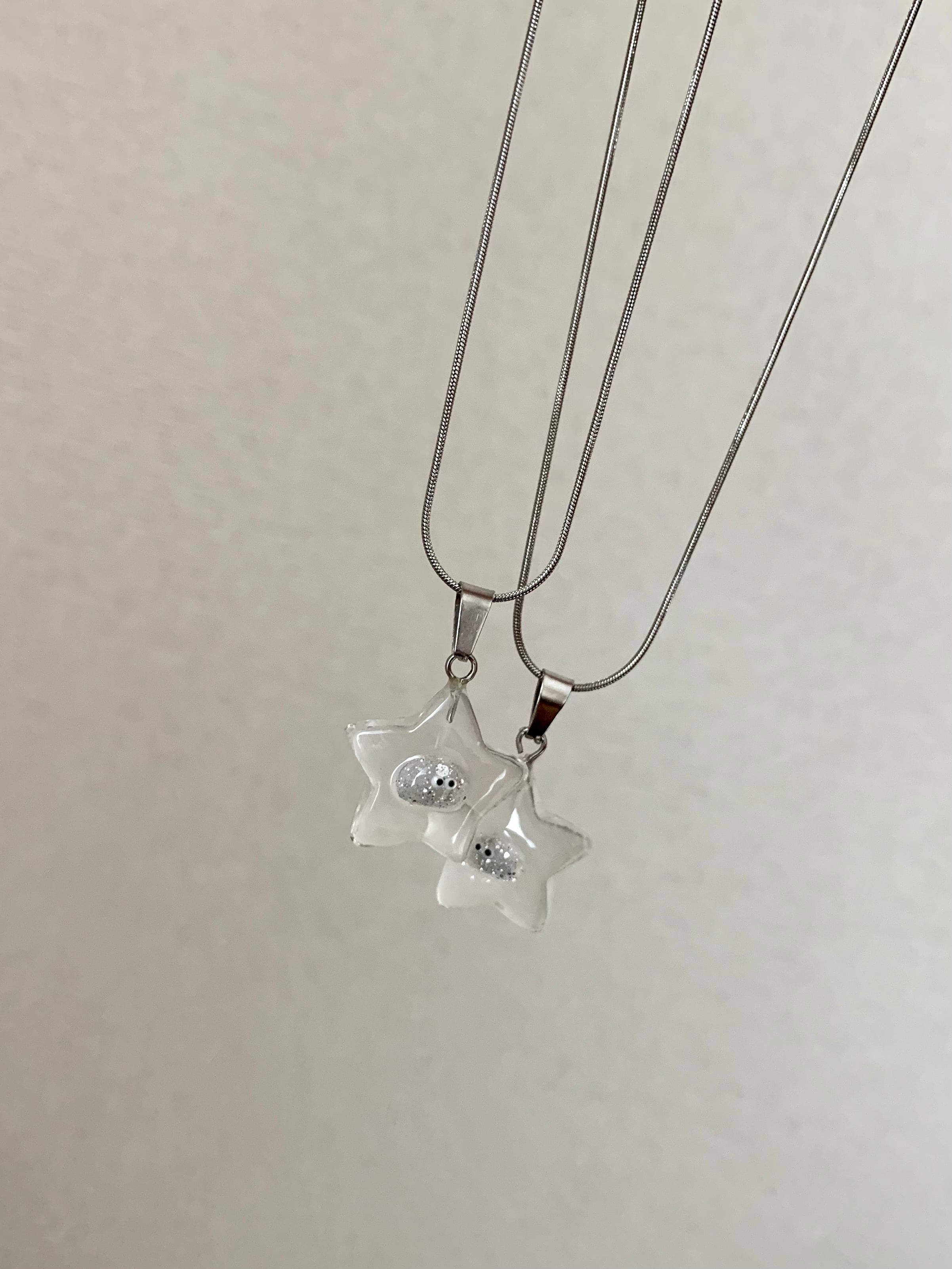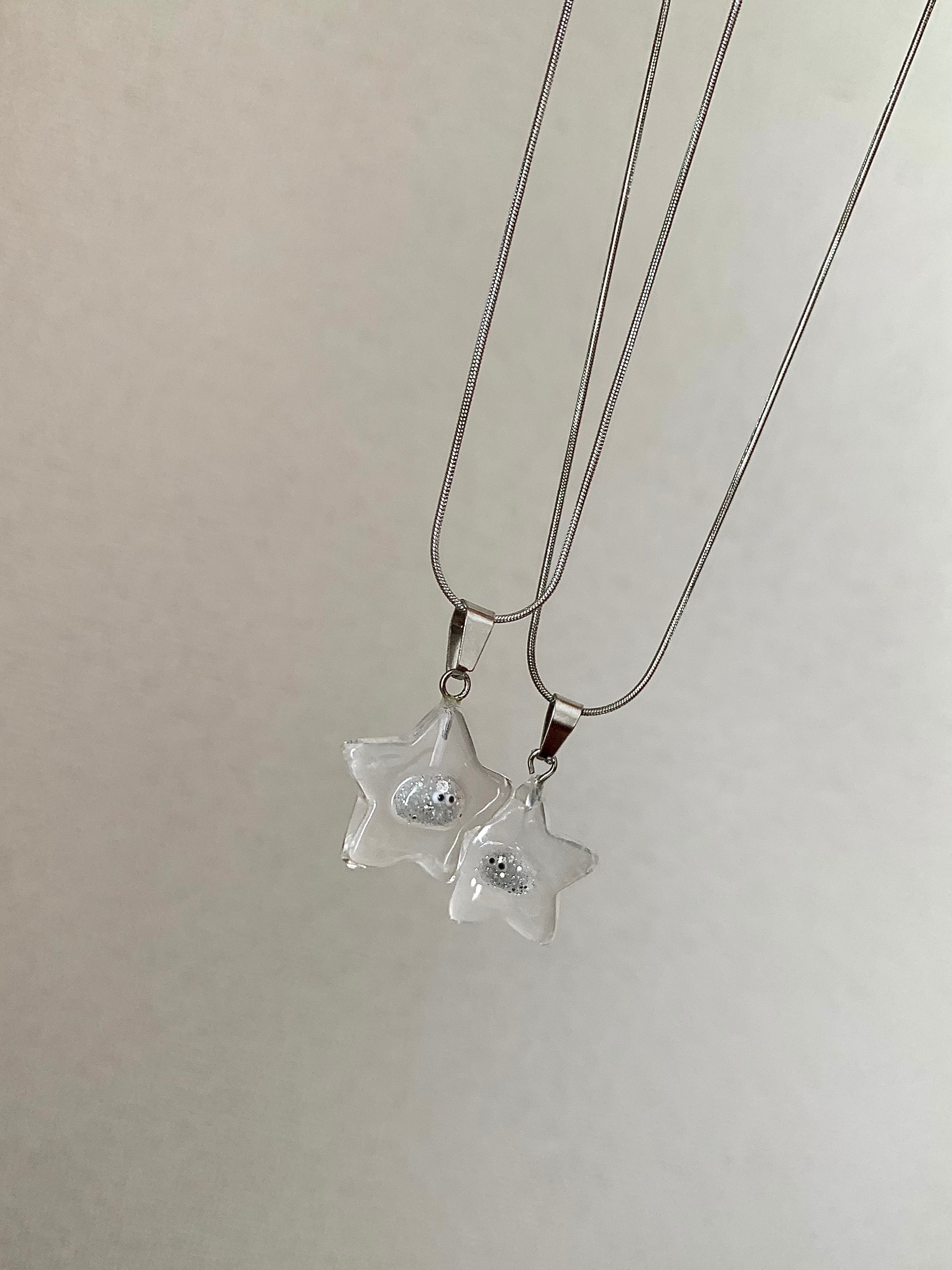 素材:ステンレスシルバーチェーン、ガラススターチャーム、レジン